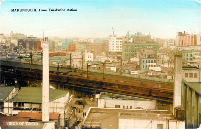 The opening of Yurakucho Station, on June 25, 1910. The photographer is standing on the elevated right-of-way being constructed for later Tokaido Main Line express train track expansion north from Shimbashi-Kasumori to Tokyo’s new planned terminal, Tokyo Central Station, that would be completed in 1914.