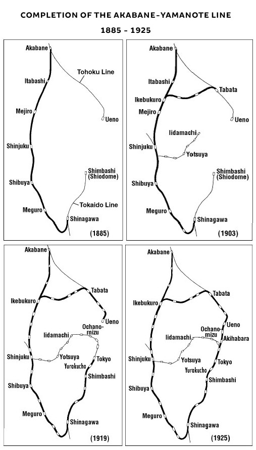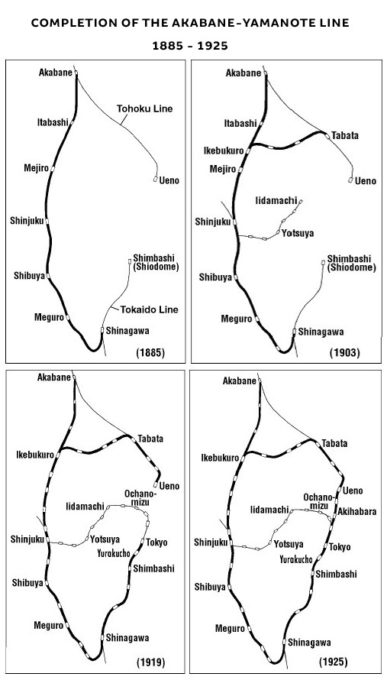 Yamanote née Akabane Line (solid black line) history, 1885-1925, depicting the construction stages and the eventual completion of Tokyo’s famous “circle” commuter line – but not until 1925.